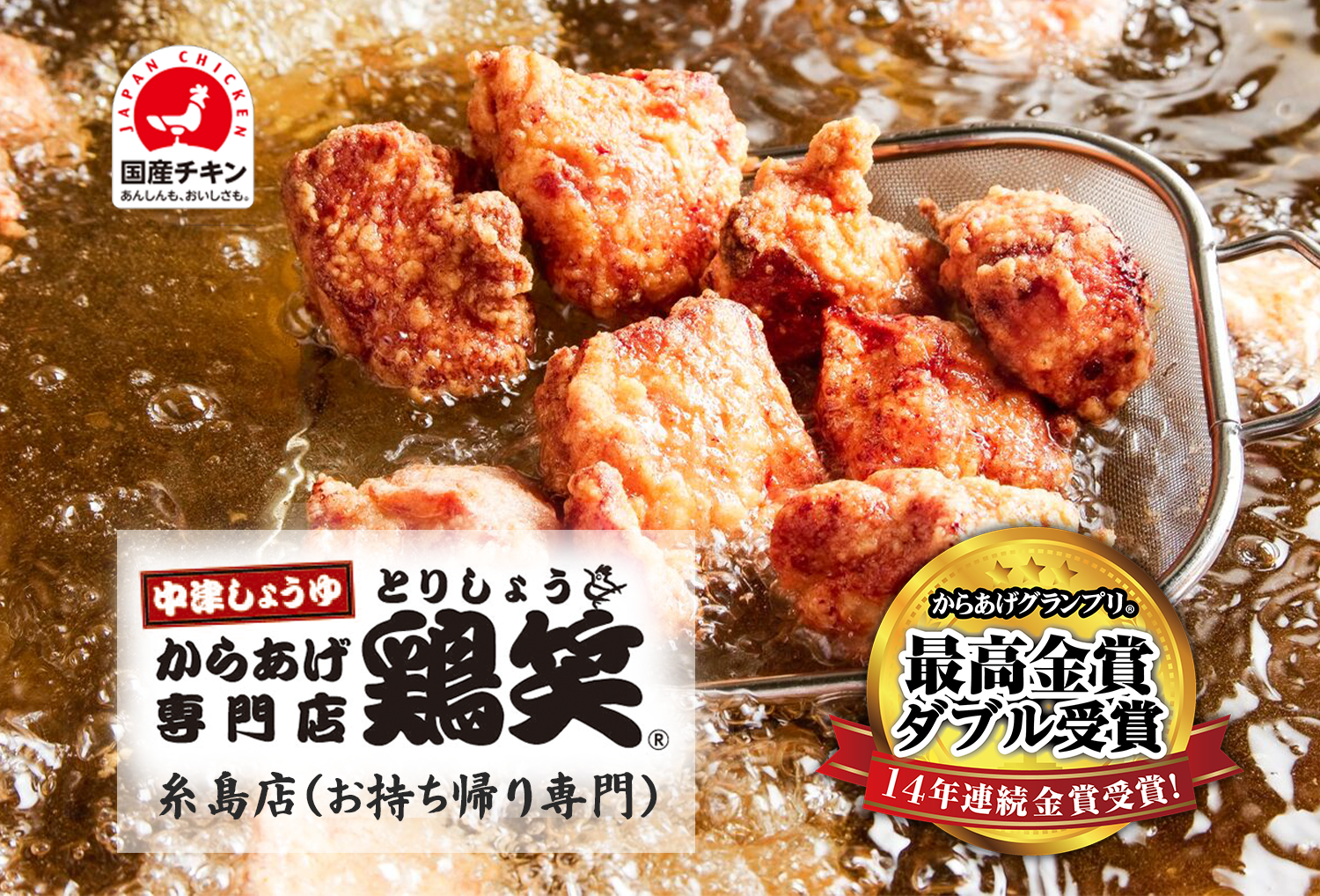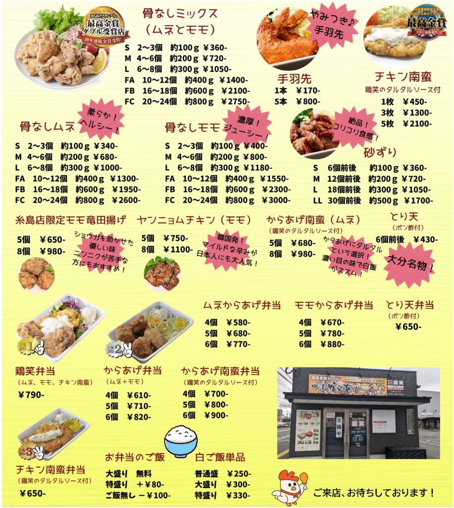 美味しい鶏(からあげ)を食し、 思わず笑み(笑顔)がこぼれる、 そのような想いを店舗名に込めました。
